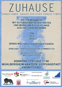 Im Rahmen der „Internationalen Woche gegen Rassismus“ beteiligen sich die Naturfreunde Pfungstadt am Sonntag, den 13.3.2022, mit dem Thema „Zuhause haben – Zuhause verlieren – Zuhause finden“. Der musikalische Themenabend unter der Leitung von Wolfgang Vetter erzählt die Erlebnisse von Flüchtlingen aus drei Generationen 1946, 1973, 2015, deren Weg nach Südhessen führte. Autobiografische Texte und Musik werden in ein atmosphärisches Musikprogramm eingebunden. Das Abendprogramm bilden die Berichte von Vertriebenen, politischen Flüchtlingen und Menschen, die aufgrund aktueller Kriegsereignisse ihr Zuhause verlassen mussten. Begleitet werden die vorgetragenen Erzählungen von einer Vielzahl stimmungsvoller Musikstücke neuvertonter Gedichte von Eduard Mörike, Wilhelm Müller oder Paul Celan. Diese ermöglichen den Zuhörenden Zugang und Anteilnahme am Themenabend „Zuhause“. Gesang und musikalische Leitung verantwortet Wolfgang Vetter, Stimmwolf e.V. stellt Sprecher, Chor & Kammerorchester. Der Themenabend wird gefördert von der Partnerschaft für Demokratie in Pfungstadt im Rahmen des Bundesprogramms „Demokratie leben!“ durch das Bundesministerium für Familie, Senioren, Frauen und Jugend in Kooperation mit dem Hessischen Ministerium des Innern und für Sport. Der Eintritt ist frei. Einlass ist um 16.30 Uhr im Mühlbergheim Pfungstadt, Kantstr. 21, Beginn um 17 Uhr. Für Getränke und Snack ist gesorgt. Damit die Verantwortlichen eine Übersicht über die Anzahl der Gäste haben, wird um Reservierung unter karten.zuhause@t-online.de oder Tel. 06157-86583 gebeten. Es gelten die jeweils gültigen Corona-Regelungen.