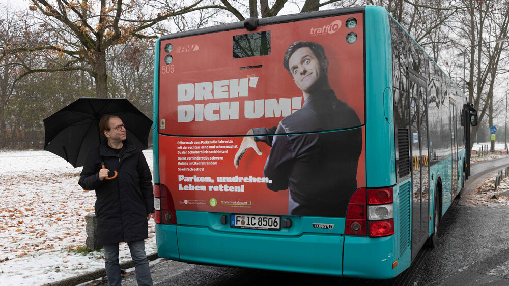 Anknüpfend an die erfolgreiche „Handkäs-Kampagne“ zum Thema Sicherheitsabstand hat das Straßenverkehrsamt 40 Busse mit dem eingängigen Kampagnenmotiv bekleben lassen, die nun bis in den Februar 2023 hinein auf 30 verschiedenen Linien im Stadtgebiet tagaus, tagein für den Holländischen Griff werben. „Die Botschaft ist klar: ‚Parken, umdrehen, Leben retten‘“, sagt Wolfgang Siefert vom Dezernat Mobilität und Gesundheit, der am Montag, 19. Dezember, einen der Busse auf Tour schickte. Er fügte hinzu: „Wir tragen das jetzt in die Stadt und zwar genau da, wo viele Menschen es bemerken werden: im Verkehr selbst.“