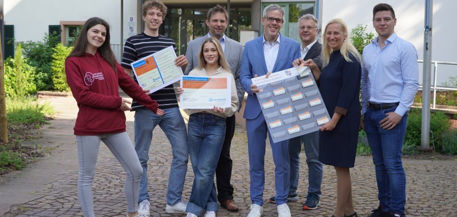 Die Erste Kreisbeigeordnete Diana Stolz (2. v. rechts) überreichte eine Organspendeausweis-Tafel an Landrat und Personalchef Christian Engelhardt (4. v. rechts). Diese hängt nun bereits im Neuen Landratsamt. Mit dabei (von links nach rechts): Sarah Reudenbach, Ole Knöller und Tami Gibson von der Lokalgruppe Organspende der Universität Heidelberg, Prof. Dr. med. Phillip Knebel (Chefarzt Allgemein- und Viszeralchirurgie am Kreiskrankenhaus Bergstraße), Heppenheims Bürgermeister Rainer Burelbach und Knochenmarkspender Florian Hofmann. (Foto: Kreis Bergstraße)