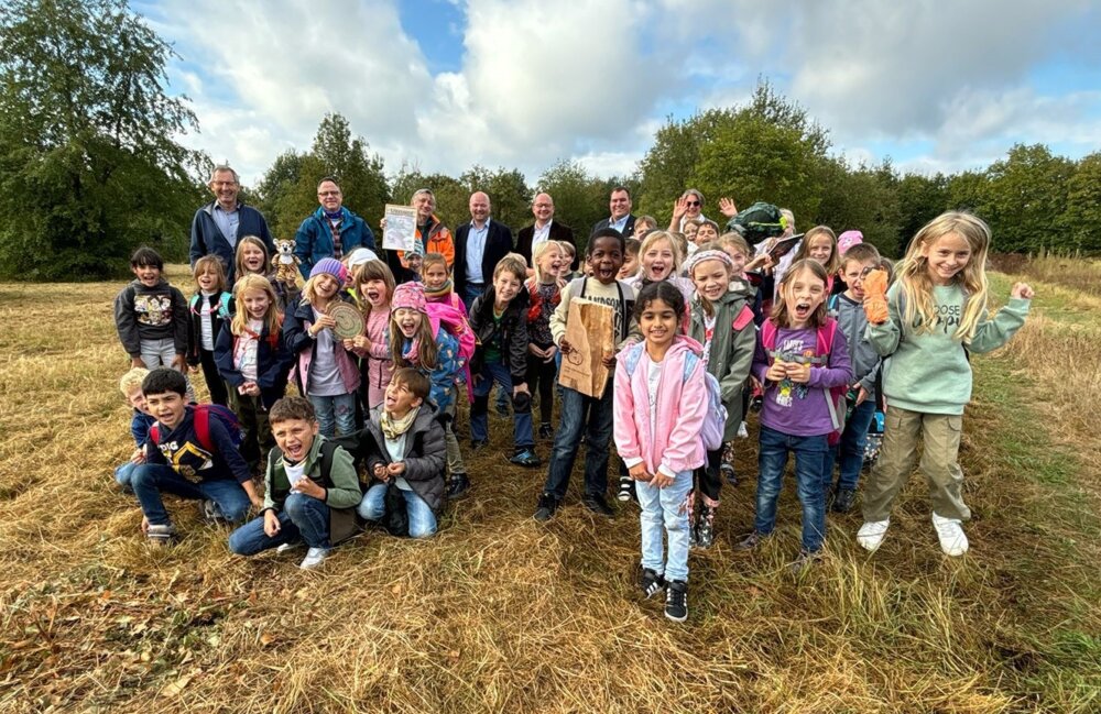 Große Freude bei den Kids der Käthe-Paulus-Schule Mainhausen: Die Verantwortlichen des Regionalverbands FrankfurtRheinMain übergaben jüngst die Auszeichnung zur „Streuobstkommune 2024“ an die Gemeinde Mainhausen um Bürgermeister Frank Simon. Hintere Reihe v. l. n. r.: Harald Classen (BUND), Kai Gerfelder (Mitglied der Verbandskammer des Regionalverbandes FrankfurtRheinMain), Hartmut Müller (Arbeitsgemeinschaft Fledermaus- und Amphibienschutz Seligenstadt und Mainhausen), Bastian Sauer (Regionaler Streuobstbeauftragter Regionalverband), Rouven Kötter (Erster Beigeordneter Regionalverband), Frank Simon (Bürgermeister Mainhausen), Jessica Eizenhöfer (Schulleitung Käthe-Paulus-Schule Mainhausen). (Foto: Regionalverband)