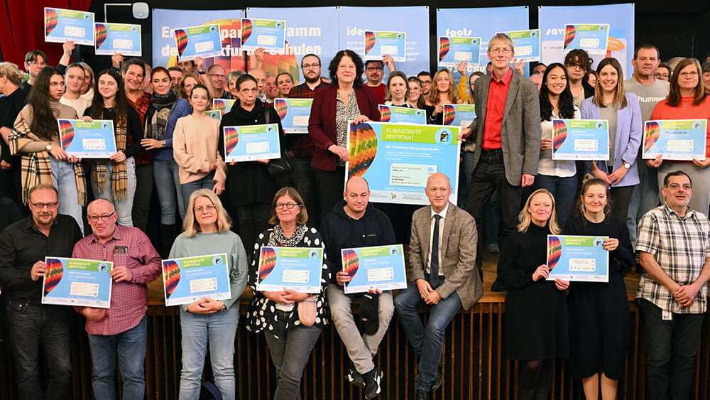 Für ihre engagierte Arbeit bekommen die Energiesparschulen von Bildungsdezernentin Weber und dem Abteilungsleiter Energiemanagement Mathias Linder ein symbolisches Klimaschutz-Zertifikat überreicht.