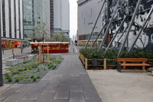 Schwenke verwies auf das „Grüne Band“ aus dem Zukunftskonzept Innenstadt, das den Hugenottenplatz, den Stadthof und den Platz der Deutschen Einheit mit Pflanzen verbindet: „Auch, wenn die Nutzung jetzt nur temporär ist, passt sie damit für die nächsten Jahre perfekt in unser Konzept ‚Grünes Band‘.“ Paul-Gerhard Weiß ergänzt abschließend: „Entstanden ist ein Ort mit Grün, an dem sich Menschen aufhalten und bewegen können – vielleicht nur mal kurz für ein Gespräch, beim Boule, einem gemeinsamen Kaffee oder für einen Moment zum Durchatmen.“