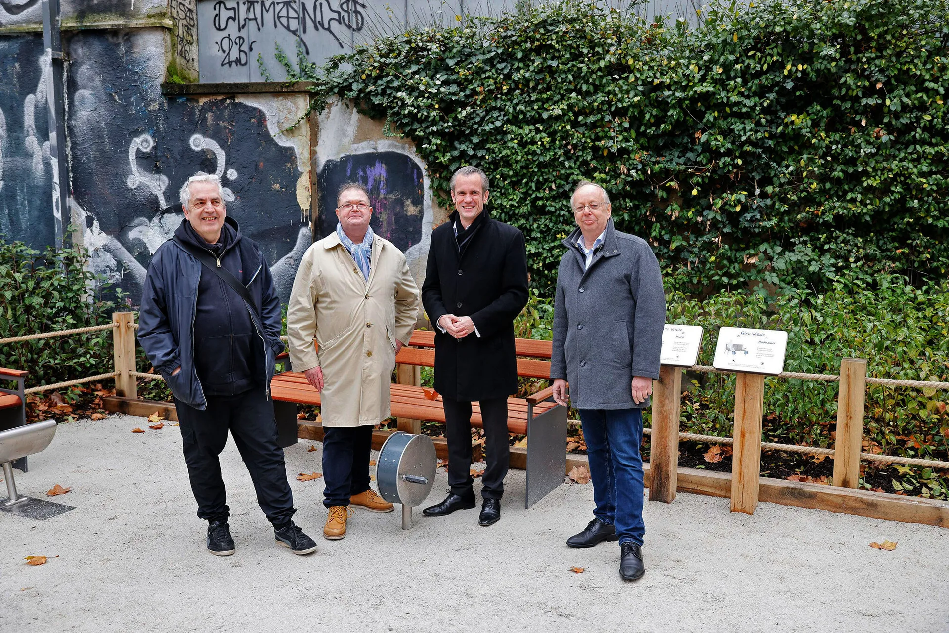 Oberbürgermeister Dr. Felix Schwenke und Stadtrat Paul-Gerhard Weiß eröffneten die Grünfläche mitten in der Innenstadt. Links im Bild sind Professor Heiner Blum und Eigentümer Kilian Bumiller zu sehen. Blum ist Professor für experimentelle Raumkonzepte an der Hochschule für Gestaltung. Zusammen mit einer Gruppe Studierender gestaltet er die Wand des Nachbargebäudes, Herrnstraße 36. (Foto: Stadt Offenbach / georg-foto, offenbach)