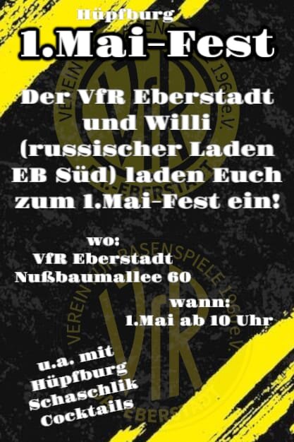 Wer am 1. Mai auf Tour geht, ist nicht nur gerne in der Nußbaumallee 60 gesehen, es wird auch einiges für junge und ältere Semester geboten. Wer also die neue Clubatmosphäre genießen möchte, ist hier an der richtigen Adresse. Das Engagement der “Alten Herren” geht in diesem Jahr auch noch weiter. Beim Stadtteilfest, am Samstag, den 14.6.25, gibt es einen Getränkestand, der alle versorgt. Auch VfR Eberstadt T-Shirts sind hier Dank unseres Sponsors 1APersonal erhältlich.