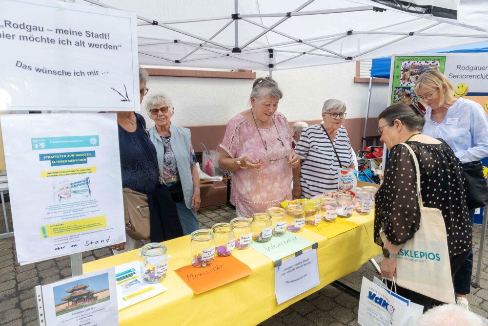 Unter den Informationsständen fanden sich viele, die regelmäßig dabei sind wie die Johanniter, die über konkrete Alltagshilfen informierten. Mit dabei waren unter anderem auch die Geriatrische Tagesklinik der Asklepios Klinik Seligenstadt, die Bürgerhilfe Rodgau e.V., CareKomm Pflegedienst, die Sozialstation Rodgau gGmbH, die VHS Stadt Rodgau, rodgaucard, das Hildegard von Bingen Senioren-Zentrum, „Tante Emma“ und viele weitere – eine bunte Mischung aus Einrichtungen, Vereinen und Initiativen. Die Selbsthilfegruppe Rodgauer Diabetiker konnte leider kurzfristig nicht dabei sein. Beim Stand der Rodgauer Seniorenclubs gab’s ein kleines Gewinnspiel mit tollen Preisen – unter anderem eine rodgaucard mit Guthaben, eine Jahreskarte fürs Strandbad Nieder-Roden, Gutscheine für Kultur und VHS-Angebote sowie Bäckerei-Gutscheine. Plus: bunte Glassteine, die man in Gläser mit Begriffen wie barrierefreier Zugang, Generationenhaus oder Fahrdienste werfen konnte, um auf Missstände aufmerksam zu machen. Das hilft den Seniorenclubs, die Bedürfnisse besser zu erfassen und die Kommunikation mit der Stadt zu verbessern.