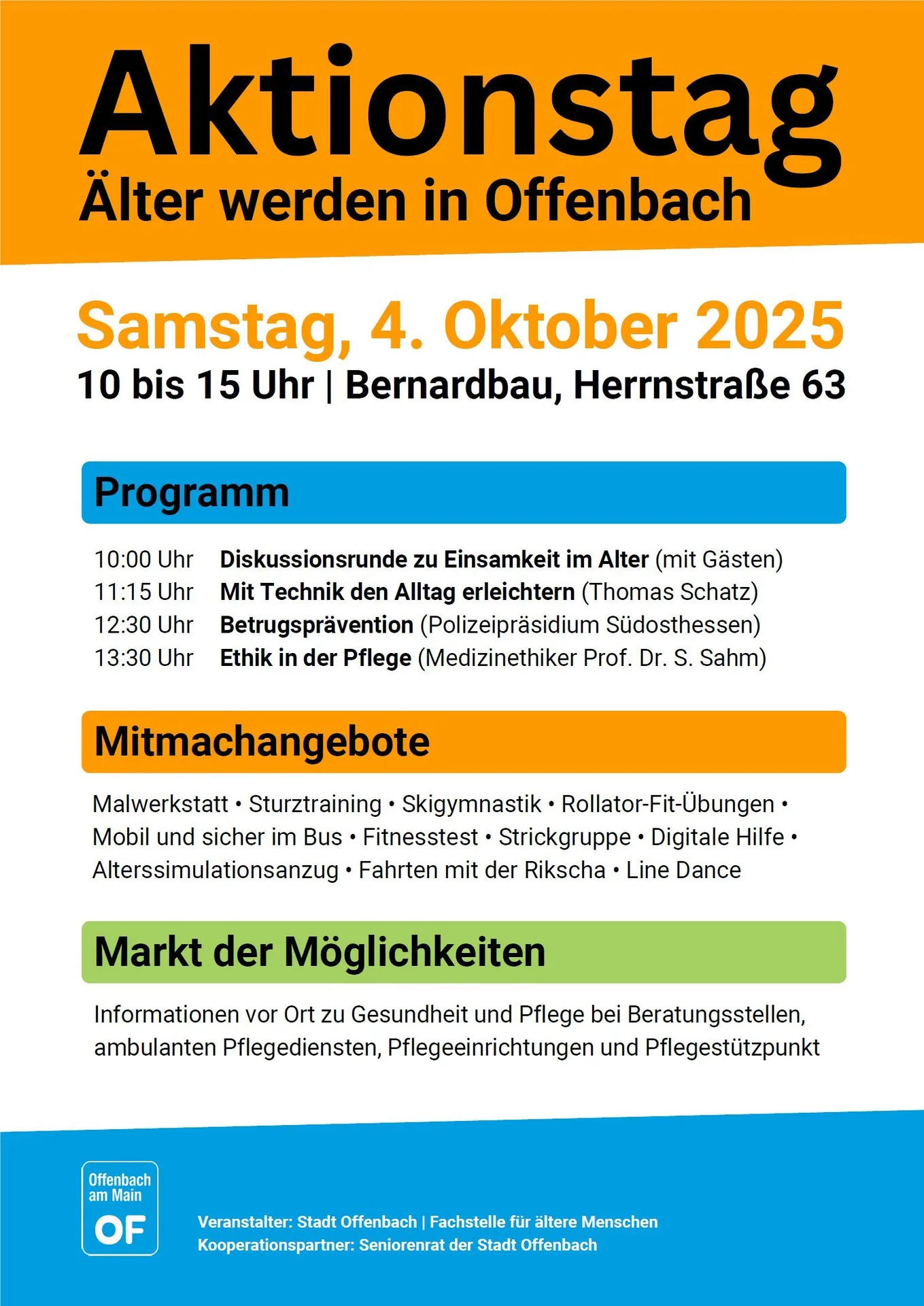 Die Fachstelle für ältere Menschen in Offenbach veranstaltet am Samstag, 4. Oktober 2025, in der Zeit zwischen 10 und 15 Uhr den „Aktionstag – Älter werden in Offenbach“. Auf dem Gelände des Bernardbaus in der Herrnstraße 63 wird ein umfangreiches Programm geboten. Der Aktionstag soll Antworten auf die Frage geben, wie ein möglichst langes und eigenständiges Leben gelingen kann. Neben städtischen Ansprechpersonen präsentieren Wohlfahrtsverbände, Polizei, Vereine und Initiativen ein buntes Programm zu den Themen Wohnen, Beratung, Pflege im Alter, Demenz, Mobilität und Bildung sowie kulturelle und sportliche Angebote.