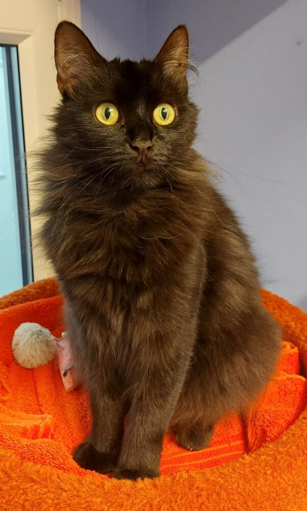 Mali, ein Haus-/Waldkatzen-Mix, ist eine Fundkatze und circa 4 Jahre alt. Sie war weder gekennzeichnet, noch kastriert und wurde bis heute nicht gesucht. Unverständlich, denn Mali ist nicht bloß eine außergewöhnlich hübsche Katze mit ihrem halblangen, schwarzen Fell und den grünen Augen; sie ist auch sehr menschenbezogen, neugierig und interessiert am menschlichen Tun und genießt Streicheleinheiten.