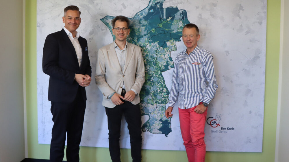 Kristian Straub, Direktor Verkauf und Marketing bei der Lufthansa Seeheim GmbH und Vorsitzender des Tourismusausschusses der Industrie- und Handelskammer Darmstadt Rhein Main Neckar hat sich bei einem Antrittsbesuch im Landratsamt Groß-Gerau mit Landrat Thomas Will über die aktuellen Entwicklungen im Kreis Groß-Gerau ausgetauscht. Begleitet wurde Straub von Dr. Daniel Theobald, Geschäftsbereichsleiter Unternehmen und Standort der Industrie- und Handelskammer Darmstadt Rhein Main Neckar.