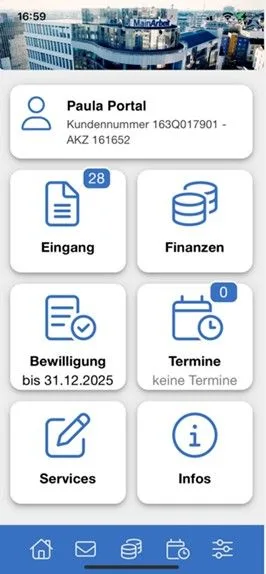 Die App macht die Nutzung des Kundenportals am mobilen Endgerät noch einfacher und übersichtlicher. Neben Funktionen wie Push-Benachrichtigungen oder dem Login per Touch- oder Face-ID bietet sie praktische Unterstützung im Alltag: Nutzerinnen und Nutzer können Änderungen wie neu eingestellte Dokumente des Jobcenters, Hinweise zu ablaufenden Bewilligungszeiträumen oder Anpassungen der Finanzdaten wie z.B. die Auszahlungstermine direkt auf den Startscreen angezeigt bekommen. Zudem wird an den Weiterbewilligungsantrag (WBA) erinnert, der gleich mit vorausgefüllten Daten wie Name, Vorname oder Aktenzeichen aufrufbar ist und online eingereicht werden kann.