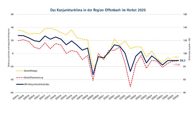 Für die Wirtschaft in Stadt und Kreis Offenbach zeichnet sich noch keine Trendwende ab. Das zeigen die Ergebnisse der aktuellen Konjunkturumfrage der Industrie- und Handelskammer (IHK) Offenbach am Main. Viele Unternehmen empfinden ihre Geschäftslage als angespannt. Positivnachrichten bleiben die Ausnahme. Der IHK-Klimaindex verharrt bei 89,3 Punkten und liegt damit deutlich unter dem zehnjährigen Durchschnitt von 104,8 Punkten.