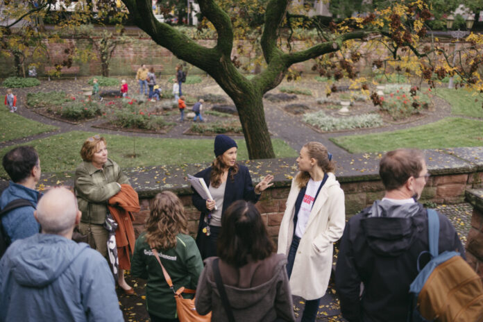 Versteckter grüner Schatz in den Wallanlagen: Klima- und Umweltdezernentin Tina Zapf-Rodríguez schaut sich gemeinsam mit Moni Friebe vom Künstler:innenkollektiv saasfee* deren Tiefgarten an. (Foto: Chris Christes)