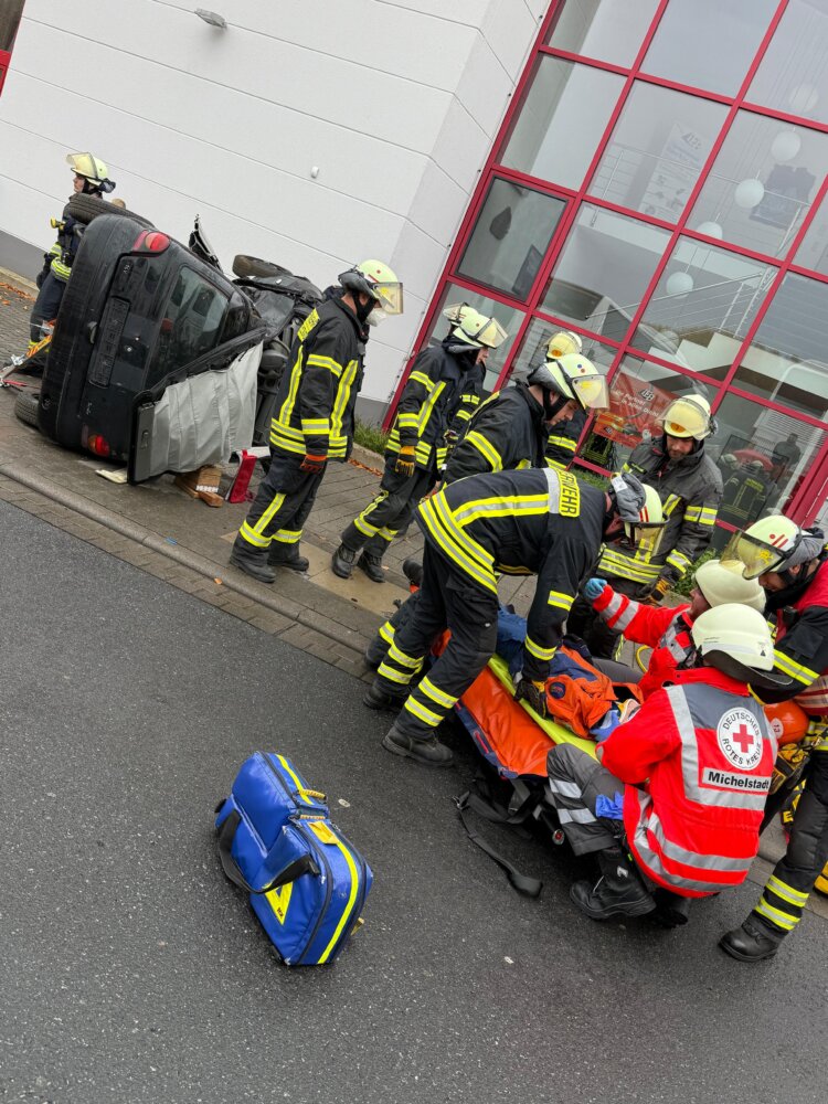 Gleichzeitig ging es beim Verkehrsunfall weiter: Zuerst musste das auf der Beifahrerseite liegende Fahrzeug gesichert werden. Anschließend wurde eine Person mittels hydraulischen Rettungsgeräts aus dem sehr stark beschädigtem Unfallfahrzeug befreit.