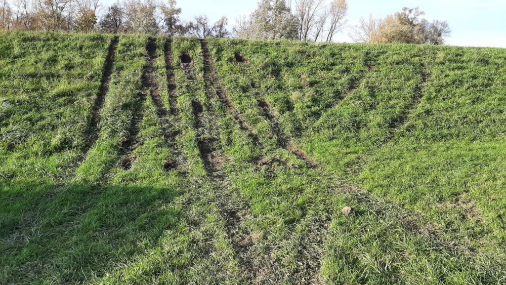 Ein sogenannter „Off-Road“-Schaden – mutmaßlich verursacht durch einen Geländewagen – dürfte nach einer ersten Schätzung einen Schaden von etwa 10.000 Euro angerichtet haben. Der Deich wurde sowohl landseitig als auch wasserseitig beschädigt. Den Reifenspuren nach zu urteilen ist ein Geländefahrzeug mehrmals über den Deich gefahren, vermutlich, um dessen Neigung zu testen. Der aufmerksame Bürger hat den entstandenen Schaden am 3. November festgestellt.