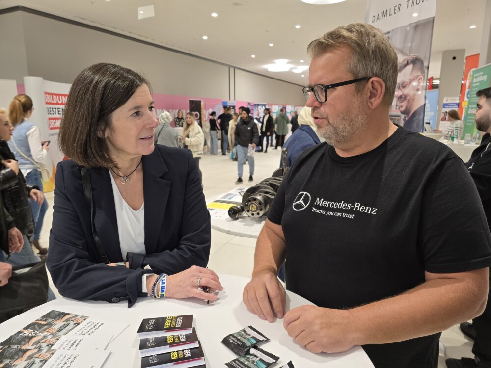 Die Vorfreude auf die größte Jobmesse, die der Landkreis Darmstadt-Dieburg jemals veranstaltet hat, war riesig. Im Loop5 präsentierten am Donnerstag 74 Arbeitgeber ihre Job- und Ausbildungsangebote. Die bange Frage, ob denn auch genügend Jobinteressenten vorbeischauen, war eigentlich schon vor Beginn der Veranstaltung um 10 Uhr beantwortet: Schon zehn Minuten vorher stand der erste Interessent am Stand von Heag Mobilo, wie Sprecherin Kerstin Kutscher berichtete. Dann ging es Schlag auf Schlag: „Wir hatten schon lange nicht mehr eine so hohe Kundenfrequenz für einen Donnerstagvormittag“, sagte Centermanagerin Nicole Kurtovic. „Wir wurden zum Teil überrannt“, konnte Swen Gärtner von der Daimler Truck AG aus Weiterstadt berichten. Die 1000 Flyer, die den Weg zu den fünf thematisch gegliederten Zonen auf drei Ebenen zeigten, waren schon nach einer Stunde vergriffen, wie Stephanie Friedel vom Arbeitgeberservice des Landkreises am frühen Nachmittag berichtete. Eilig wurden auf allen verfügbaren Druckern bei „LaDaDi vor Ort“, der Niederlassung des Landkreises im Retailtainment-Shoppingcenter, und beim Loop5 selbst neue Flyer ausgedruckt – die um 14 Uhr auch schon fast wieder vergriffen waren. Um 12 Uhr waren bereits 1000 Anmeldungen registriert – bei 4500 Einladungen, die an Kunden des Jobcenters verschickt worden waren, eine enorme Quote. „Wenn wir normalerweise am Ende bei etwa 20 Prozent landen, ist das ein guter Anteil“, erklärte Stephanie Friedel. Diese Quote war bereits nach zwei Stunden übertroffen. Die Messe dauerte sechs Stunden. Am Ende waren es etwa 1500 Jobinteressierte, die registriert wurden. Nicht registriert werden konnten Besucher, die ohne Einladung vorbeischauten und sich informierten. „Das ist phänomenal und zeigt, dass wir mit der Kooperation mit dem Loop5 für eine Jobmesse eine goldrichtige Entscheidung getroffen haben“, sagte Sozialdezernentin Christel Sprößler.