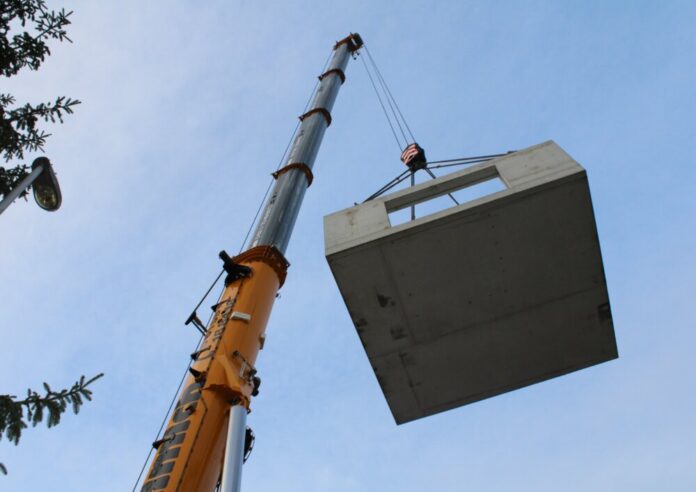 In den sehr frühen Morgenstunden des gestrigen 18. November ist der Schwerlasttransport an der Baustelle Geinsheimer Straße, Ecke Feldstraße in Riedstadt-Leeheim angekommen. Einige Stunden später montieren Bauarbeiter Haken an das Beton-Bauwerk, das ein wenig an eine flache Garage ohne Dach erinnert, die dafür ausgestattet ist mit drei großen Öffnungen. Ein Dach wird es später noch bekommen, doch wird das Bauwerk später mal keine Autos beherbergen, sondern Abwasser umleiten. Und zu sehen ist es auch nur jetzt in der Bauphase. Denn nun hebt ein Schwerlastkran das 24 Tonnen schwere Gebilde in die Höhe, schwenkt es über die Baugrube und lässt es in Präzisionsarbeit in die Baugrube mitten im Kreuzungsbereich Geinsheimer Straße/Feldstraße hinab.
