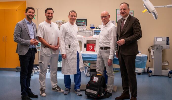 Im Bild (v.l.): Jan Voigt, Geschäftsführer der Asklepios Klinik Langen, Dano Schenk, Chefarzt für klinische Akut- und Notfallmedizin, Asklepios Klinik Langen, Dr. Michael Schütz, Chefarzt für Anästhesie & Intensivmedizin, Asklepios Klinik Langen, Christian Schönemann, Betriebsleiter Eigenbetrieb Rettungsdienst des Kreises Offenbach (ERD), Oliver Quilling, Landrat des Kreises Offenbach. (Foto: Asklepios)