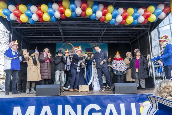 „Wir haben gesehen, unsere Tollitäten sind zahlreich erschienen. Wir haben sehr viele Aktive da, die hier zahlreich erschienen sind. Es ist auch entsprechend kühl“, erklärte Leinweber. Mit Blick auf die anstehende Wahl fügte er hinzu: „Lieber Manuel, es ist ja erst nächste Woche Wahl und von daher, so viel Zeit ist ja nicht mehr. Ihr könntet ja eigentlich das Ganze auch jetzt relativ kampflos einfach kurz hier übergeben.“ Doch Bürgermeister Manuel Friedrich zeigte sich zunächst unbeugsam. Nach kurzer Rücksprache mit Magistrat und Stadtverordneten wies er das närrische Angebot entschieden zurück. „Wir sind so gut aufgestellt wie noch nie. Das heißt, wir sind auch so motiviert wie noch nie, das Rathaus zu verteidigen. Und wir geben es auf jeden Fall nicht auf. Die Stadtkasse, der Schlüssel, der bleibt uns!“, erklärte der Rathauschef unter dem Jubel seiner Unterstützer – zumindest für den Moment. Die Narren antworteten, wie es ihrer Tradition entspricht, nicht mit Worten, sondern mit Programm.