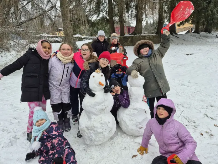 Endlich wieder Schnee auf den Spessarthöhen: 15 Jungen und Mädchen genossen bei herrlichem Winterwetter in der letzten Woche der Weihnachtsferien im Schullandheim Wegscheide den Endspurt des städtischen Sprachförderprojekts Deutschsommer. Die etwa zehn Jahre alten Grundschulkinder der vierten Jahrgangsstufe verbesserten in den täglichen Unterrichtseinheiten nicht nur ihre sprachlichen Fähigkeiten und spielten Theater. Inmitten der schönen Winterlandschaft von Bad Orb bauten sie in ihrer Freispielzeit auch Schneemänner und hatten viel Spaß beim Rodeln.