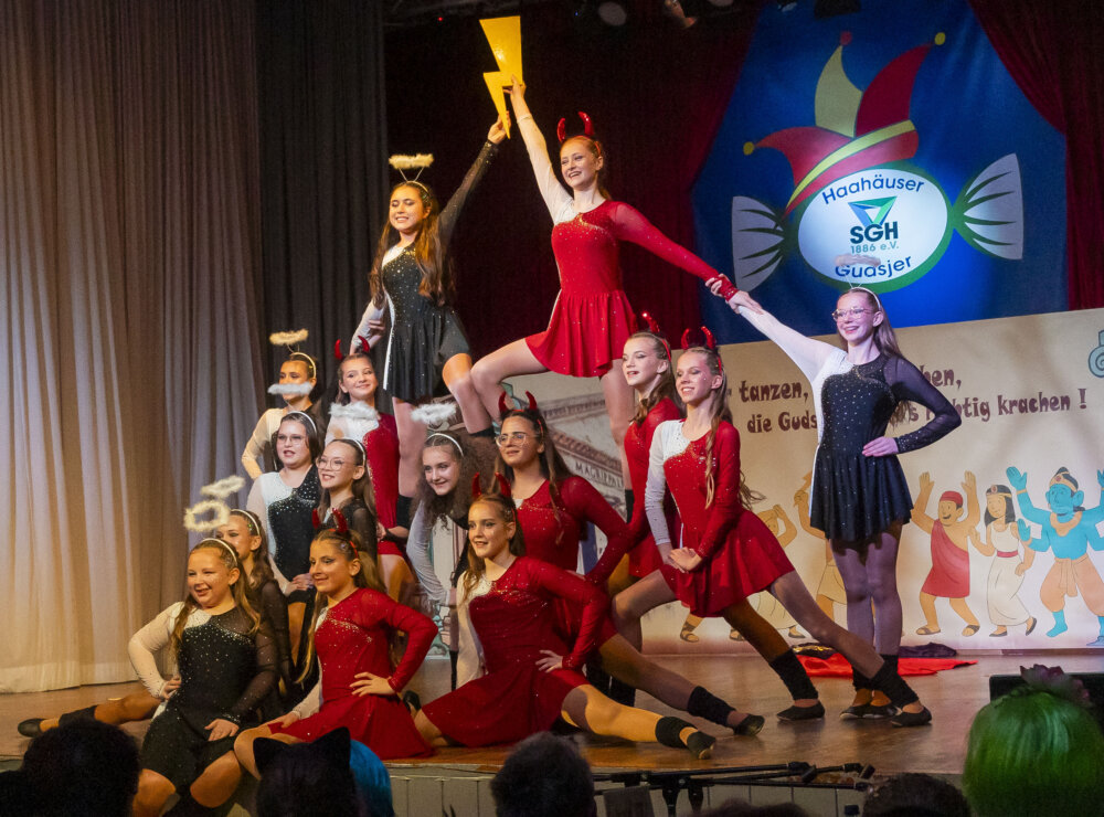 Nach der Pause zog Andreas Kraus als „Gott des Wortwitzes“ das Publikum erneut in seinen Bann und bewies einmal mehr, warum er zu den festen Größen der Hainhäuser Fassenacht gehört. Für tänzerische Bilder sorgte danach die Gruppe Passion2Dance (Pa2Da), die mit einer ganzen Schar von Göttinnen die Bühne bevölkerte – so viele wie noch nie zuvor in Hainhausen. Steffen Kuhn nahm anschließend die moderne Technik aufs Korn und verzweifelte als selbsternannter Technikheld humorvoll an Sprachsteuerungen und Siebträgermaschinen und vermutete als Grund für seine Probleme, die weiblichen Stimmen. Die Gassehopser setzten mit ihrer Showeinlage noch einen drauf und zeigten, dass weder im Ashram noch in der Turnhalle Langeweile aufkommt. Musikalisch durften natürlich die Trottwa Lersche nicht fehlen. Seit Jahrzehnten sind sie ein fester Bestandteil der Hainhäuser Fastnacht und sorgten auch diesmal wieder für Standing Ovations und lautstarkes Mitsingen. Mit der Show der „Scheene Bube“, die tänzerisch den „Fluch der Pyramide“ darstellten – natürlich mit Happy End –, erreichte der Abend seinen letzten Höhepunkt.