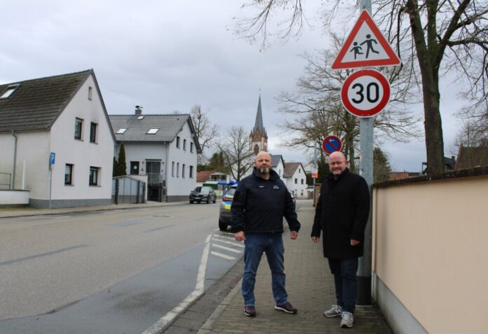 Der Leiter der Stadtpolizei Uwe Gremm und Bürgermeister Marcus Kretschmann (v.li.) vor einem Tempo-30-Schild in der Groß-Gerauer Straße. (Foto: Stadt Riedstadt)