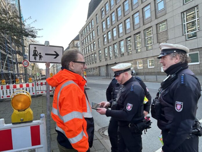 Zum Auftakt begleiteten Mobilitätsdezernent Wolfgang Siefert, Petra Lau, Amtsleiterin des städtischen Straßenverkehrsamtes sowie Mitarbeiterinnen und Mitarbeiter der Verkehrsüberwachung am Freitag, 27. Februar, eine Baustellenkontrolle, die die Verkehrspolizistinnen und -polizisten bei der Weiterbildung für den neuen Aufgabenbereich durchführten.