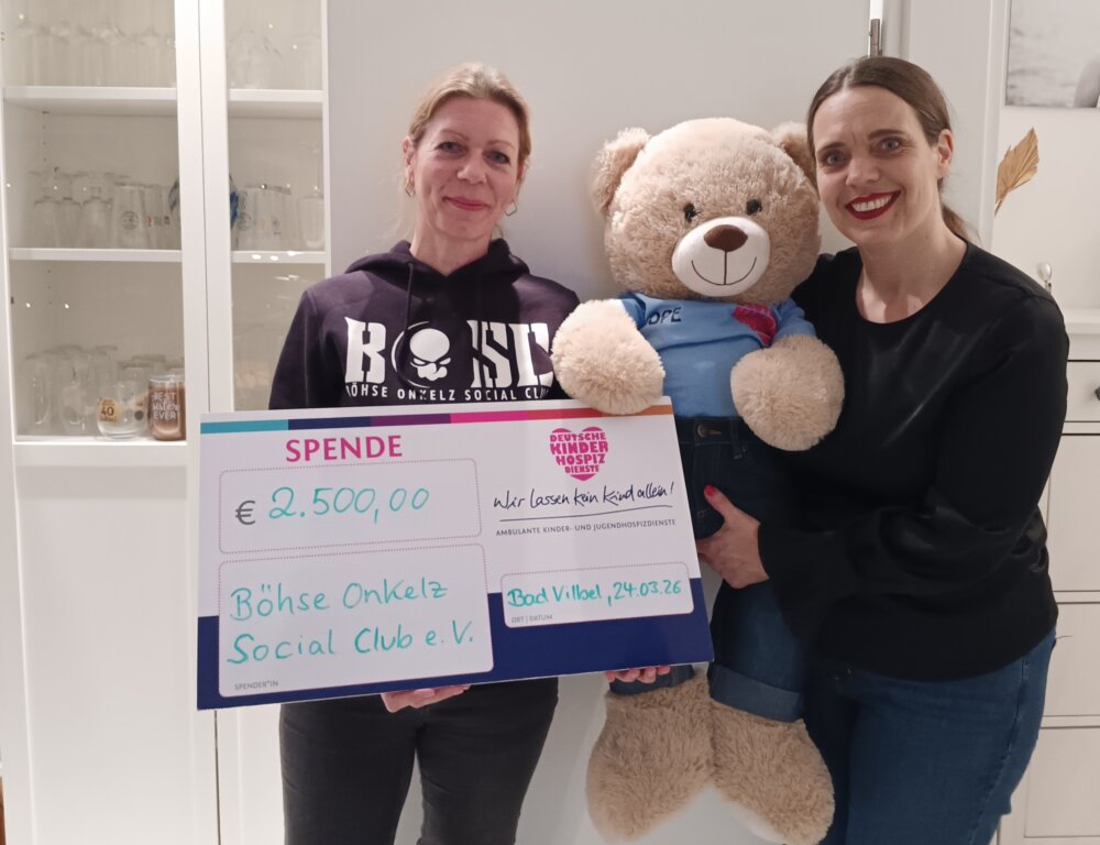 Der Böhse Onkelz Social Club e.V. (B.O.S.C.) setzt sich dafür ein, soziales Engagement in der Gesellschaft zu fördern. Dabei werden soziale Projekte selbst umgesetzt, aber auch andere Organisationen finanziell sowie mit Tatkraft unterstützt. Diese Unterstützung erfuhr aktuell das geplante „Mein Kinderhospiz Frankfurt“: Kerstin Brzezowski überreichte stellvertretend für den B.O.S.C. eine Spende über 2.500 Euro an Edith Seifert, Fundraiserin, und Hope, Bärenbotschafter, der Deutschen Kinderhospiz Dienste. Weitere Informationen unter https://deutsche-kinderhospiz-dienste.de/ oder auf https://www.instagram.com/hope.kommt.rum/.
