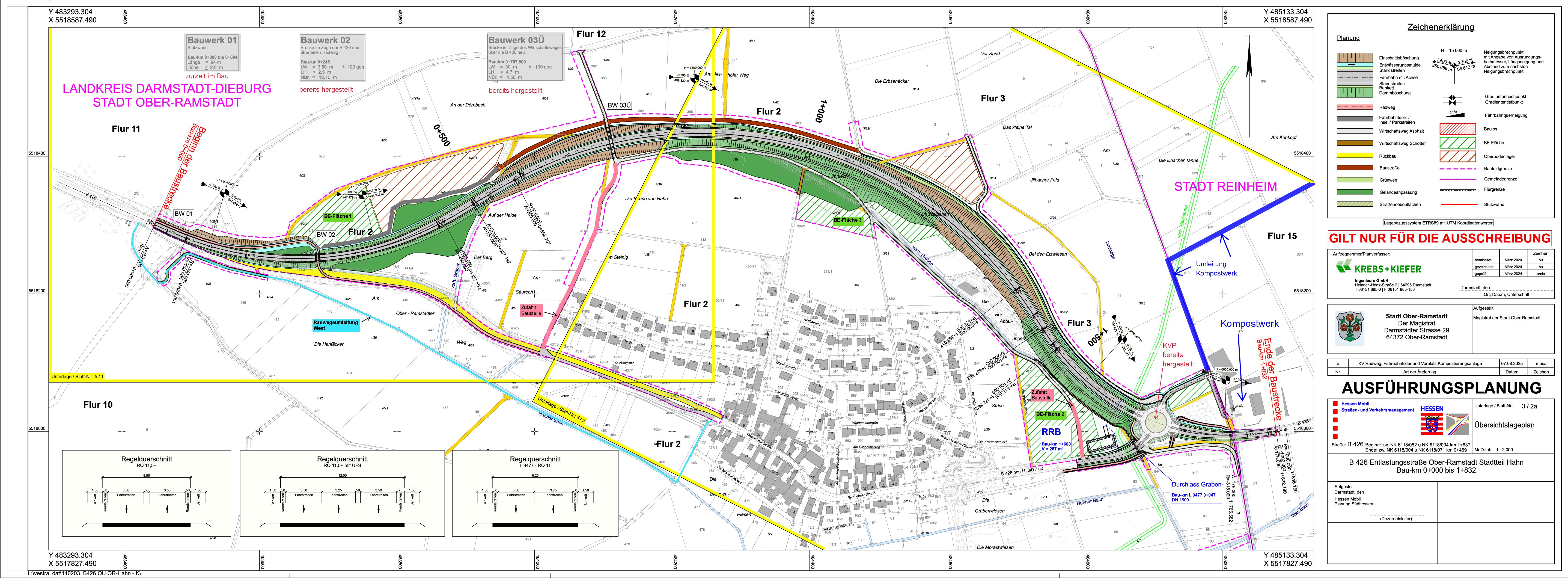 Kreisverkehr/Anbindung L3477: Von Hahn in Richtung Reinheim wird die Fahrbahn mit einer Rampe an den neuen Kreisverkehr angeschlossen, ein Teil der alten B426 wird in diesem Zuge zurückgebaut. Im Bereich des Kreisverkehrsplatzes werden zudem noch Flachbordsteine aufgeklebt, Verkehrsinseln hergestellt und der Innenkreisel mit Oberboden aufgefüllt.