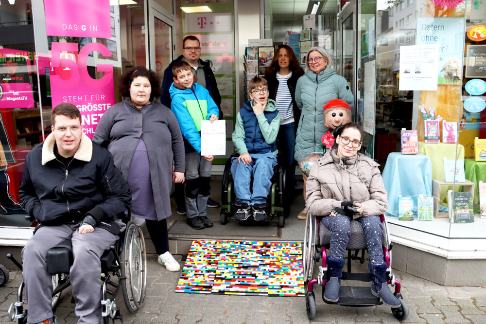 Eine Gruppe von Schülern der Langener Erich-Kästner-Schule und ihre Betreuerinnen übergaben jetzt eine Auffahrhilfe aus gebrauchten Legosteinen der Buchhandlung „litera“ und dem „greem Handyshop Langen“ an der Bahnstraße 30/32. Die Rampe hatten sie im Rahmen ihrer Projektwoche mit dem Thema „Die Welt ist bunt“ gebaut. Mit der bunten Rampe können Menschen mit Rollstuhl, Rollator und Kinderwagen nun selbstständig und bequem die Stufe zu den Geschäften überwinden.