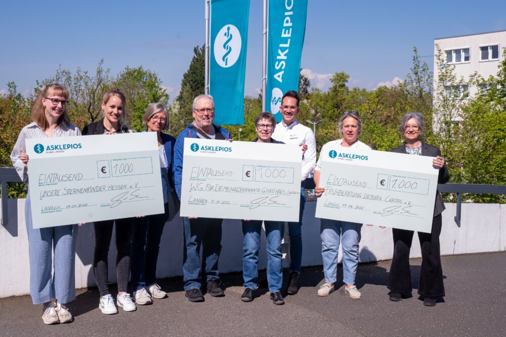 Auch in diesem Jahr folgte die Klinikleitung den Vorschlägen ihrer Beschäftigten und spendete insgesamt 3.000 Euro. Jeweils 1.000 Euro gingen an den Verein „Unsere Sternenkinder Hessen e. V.“, die Demenz-Wohngemeinschaft des Ginkgo Haus Langen e. V. sowie an die Frühberatung für entwicklungsgefährdete Kinder und ihre Familien des Caritasverbands Darmstadt e. V. in Dieburg.