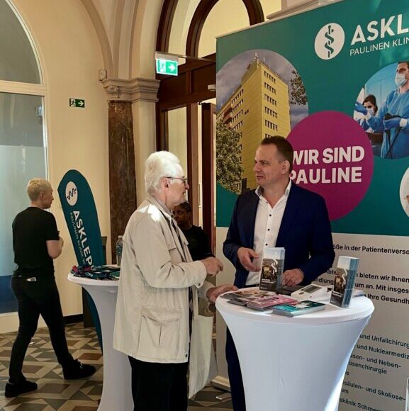 Prof. Dr. Martin Hoffmann, Chefarzt der Klinik für Allgemein-, Viszeral- und Minimalinvasive Chirurgie und stellvertretender Ärztlicher Direktor der Asklepios Paulinen Klinik Wiesbaden im Gespräch mit Besucherinnen und Besuchern am Ausstellungsstand.