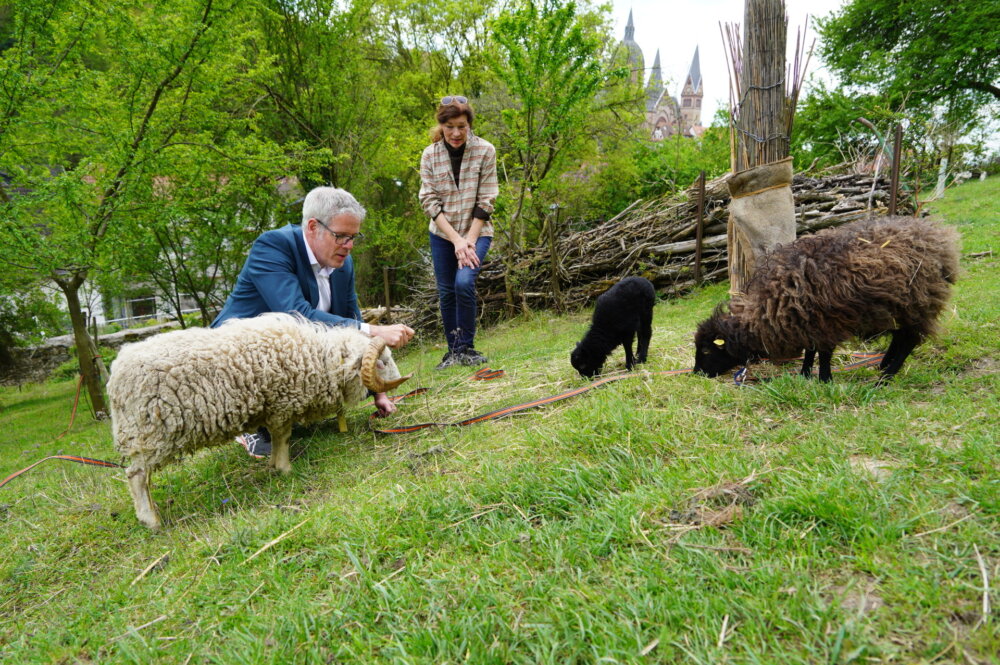 „Hier“, das war die Streuobstwiese von Beate Weis, der Zweiten Vorsitzenden des Vereins Genial Regional. Sie liegt direkt am alten Mühlenweg am Heppenheimer Schlossberg. Luftlinie sind es noch nicht einmal einhundert Meter bis zur Heppenheimer Siegfriedstraße. Aber hinter den Wohnhäusern im idyllischen Grün hört und sieht man die Autos kaum noch. Auf der Hangwiese stehen alte Streuobstbäume, unter denen Zwergschafe weiden und die Wiese „mähen“. Eine Benjeshecke und mehrere alte Baumstümpfe ehemaliger Obstbäume bieten zahlreichen Vögeln und Insekten Lebensraum. „Totholz bedeutet auf Streuobstwiesen immer Leben! So ein abgestorbener Obstbaum zieht nicht nur zahlreiche Insekten an, sondern auch viele einheimische Vögel, die selten geworden sind und die Stümpfe als Nistplätze nutzen“, erklärte Beate Weis.